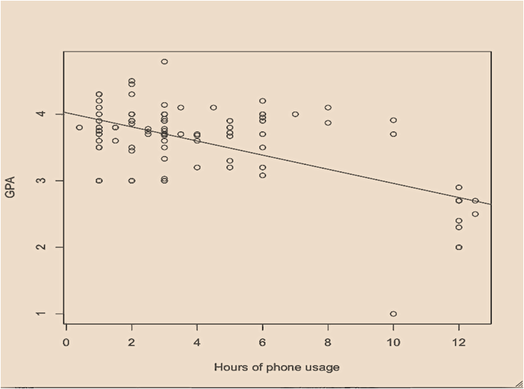 One group sent out a poll to their friends on facebook, asking for, among other information, hours per day spent on the phone, and grade point average. While it’s not necessarily a causal effect just yet, the negative association was stronger than any of us anticipated, suggesting that as time spent on the phone goes up, GPA goes down.