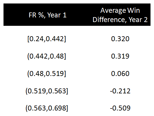 Since 2003, teams in the bottom FR % quintile have improved, on average, 0.30 wins, while teams in the top FR % quintile have lost, on average, half of a win. While that might not seem like an overwhelming effect, keep in mind each NFL team plays only 16 games.