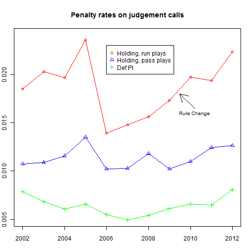 Further, there’s been a fairly steady increase in holding rates on run plays since 2006 – perhaps the 2009 jump was simply part of a larger pattern of increased infractions.