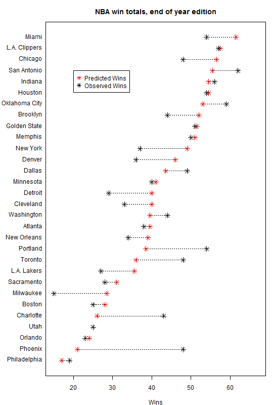 Here’s a plot of the observed and expected 2013-14 NBA season wins. For the expected, I used the season’s projections from sportsbetting.ag, posted in mid-October.