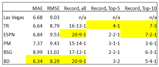 Of course, the record (wins-losses- ties) of each projection system, relative to the Las Vegas line, is another important metric. I used all 30 teams’ projections (labeled as “Record, overall”), as well as their top-10 and top-5 picks, which was judged by the difference between team projections and the Vegas line. For example, Team Rankings went 4-1 with its top-5 picks, hitting the unders on Brooklyn and Houston, the overs on Charlotte and Brooklyn, while missing in taking the over on Boston. Those were the only five picks in which TR deviated from the Vegas spread by more than three wins.