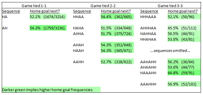 For example, the home team scores more often after sequence AH than sequence HA (54.3%, versus 52.1%), suggesting a slight increase in goal likelihood for the team that tied the game at 1-1.
