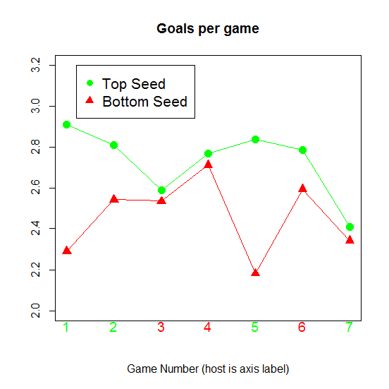 How about total goal volume?  Here’s a scatter plot of average goals per game, for both the top seed (green) and the lower seed (red). On average, there appear to be fewer goals scored in game 7’s, at least by the home team.