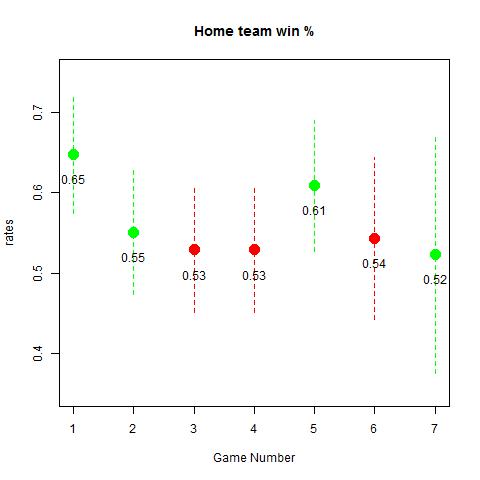 In terms of win percentage, going back to 2002, home games have won 57% of Game’s 1 through 6, and 52% of Game 7s. Here’s a chart of the likelihood of the home team winning (along with 95% confidence intervals) by game number.