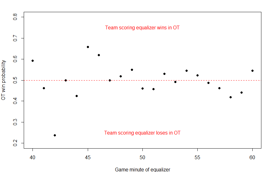 The question posed using the tweet the beginning of the blog, however, was whether or not equalizers scored just before the end of regulation were associated with OT win likelihood. This has been asked before, most notably at the end of this column by Grantland’s Bill Barnwell. Here, I’ll briefly expand.