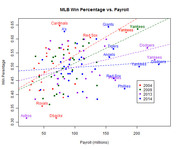Teams spending money in 2004 posted much higher win percentages, on average, than frugal teams. This association was weaker in 2009, and there is hardly any relationship through the first portion of the 2014 season between payroll and team performance.