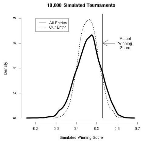 Recently, we co-wrote a paper that motivates and summarizes the prediction model that we used. In addition to describing our entry, we also simulated the tournament 10,000 times in order to help quantify how likely it was that our submission would have won the Kaggle contest.