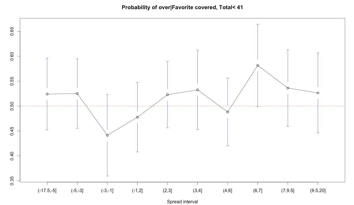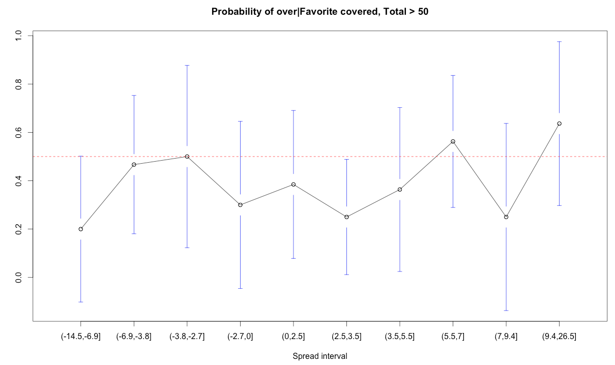 This was also interesting. It looks like for several of the intervals above, when the favorite covers there was a possible a tendency for a higher proportion of unders. In the graph, this is shown by several of the point estimates (particularly in the middle of the graph) falling below 0.50.