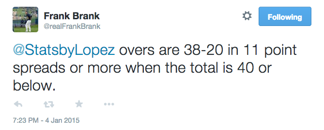 1. A better test is looking at [total – abs(spread)], and taking the bottom ~15% of all games. Then compare over success rate when favorite covered vs. when dog covered.