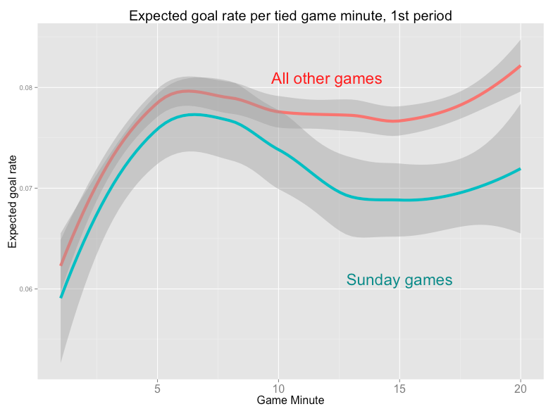 Looking at the first period, I plotted the expected goal rate per each tied-game minute (Minute 1 through 20), using a different color for games that occurred on a Sunday and those occurring on all other days. I also included 95% confidence bands for the loess smoother, although I should note that these are the default bands in the ggplot2 package, and might not fully account for the variability in each rate.