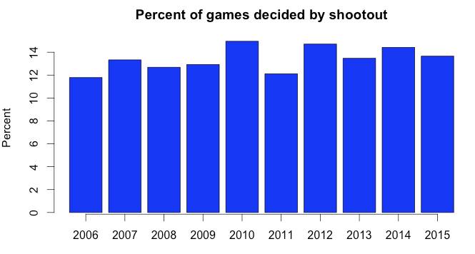 Alas, not much has changed during the 2014-15 season, despite the rule change. Overall, roughly 14% of NHL games have been decided by a shooutout this year, which is similar to past years.