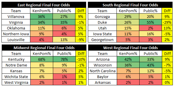 And here are some Final 4 teams with decent 2015 probabilities that your opponents are picking way too often: Duke, Louisville, Wisconsin, North Carolina