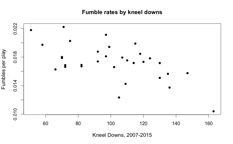 Mentioning kneel downs seems silly, but this matters. Including kneel downs in an analysis of fumbles per play inflates the denominator (number of total plays) among teams more likely to be taking a knee, as the Patriots apparently were. In fact, the correlation between fumbles per play and kneel downs is -0.6. Here’s the relationship between the two variables. Teams with lower fumble rates tend to take more kneel downs (for one of several reasons).