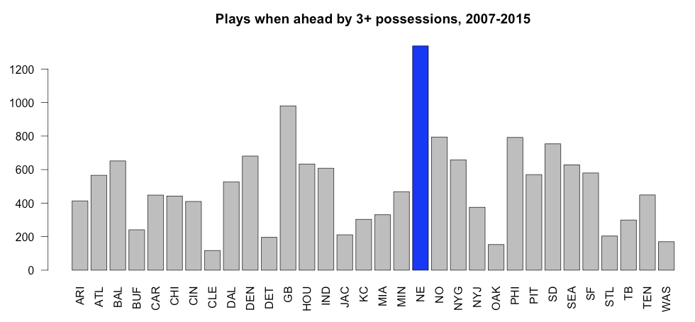 Again, the Patriots show up, with nearly three times the median number of plays when holding a three possession lead. Again, this matters. To generally contrast New England’s fumble rates with Cleveland’s, when the Patriots have run more than 11x as many plays with a 3+ possession lead as the Browns, is silly. Teams fumble with the ball less when they are leading on the scoreboard.