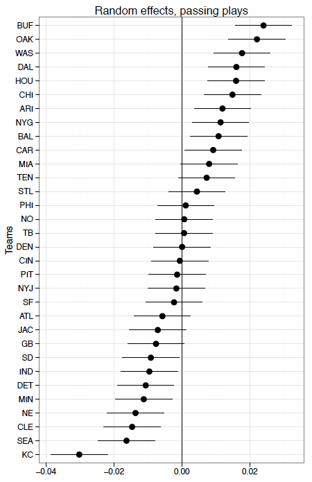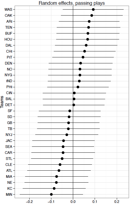 The first thing we’ll look at is a plot of random effects for each of the GLMM fits. On the left is passing plays, on the right, running plays.
