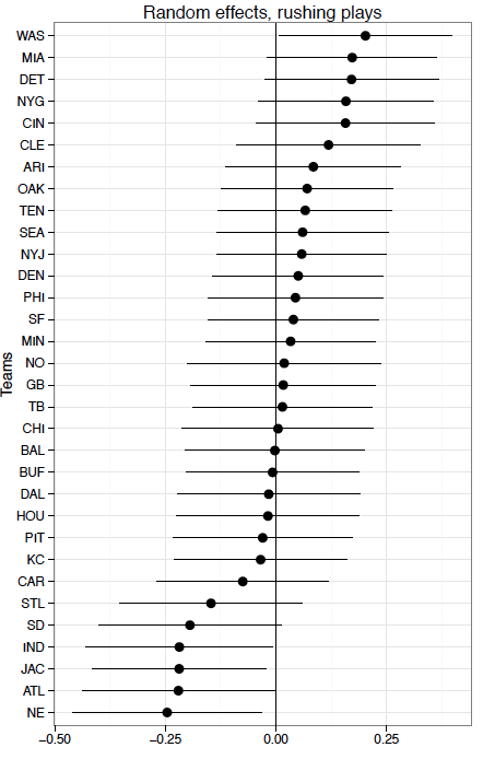 There’s slightly more descriptive ability in using random intercepts with rushing plays. The Patriots’ intercept lies the furthest from 0, but it is not noticeably different from teams like Indy, Jacksonville, and Atlanta, which also boast significantly lower rates of fumbling on running plays.