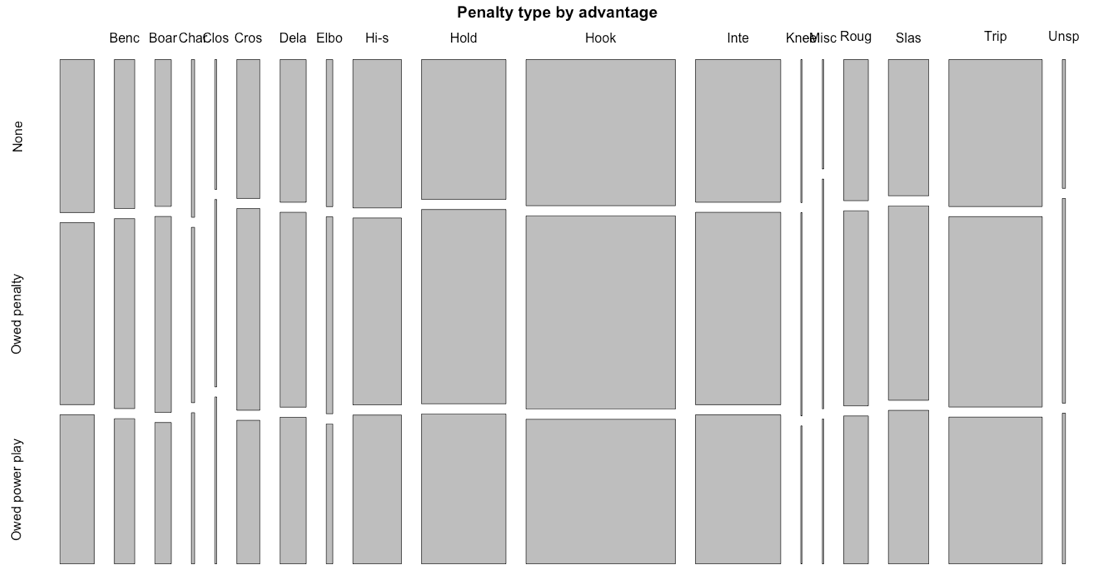 Also, Sam and Micah suggested that it would be worth looking at the type of penalty called given each scenario. While some of the penalties are of unknown types (strange data entry), here’s a mosaic plot of the types that are known, using the first four letters in the columns as the penalty type, along with the penalty differential.