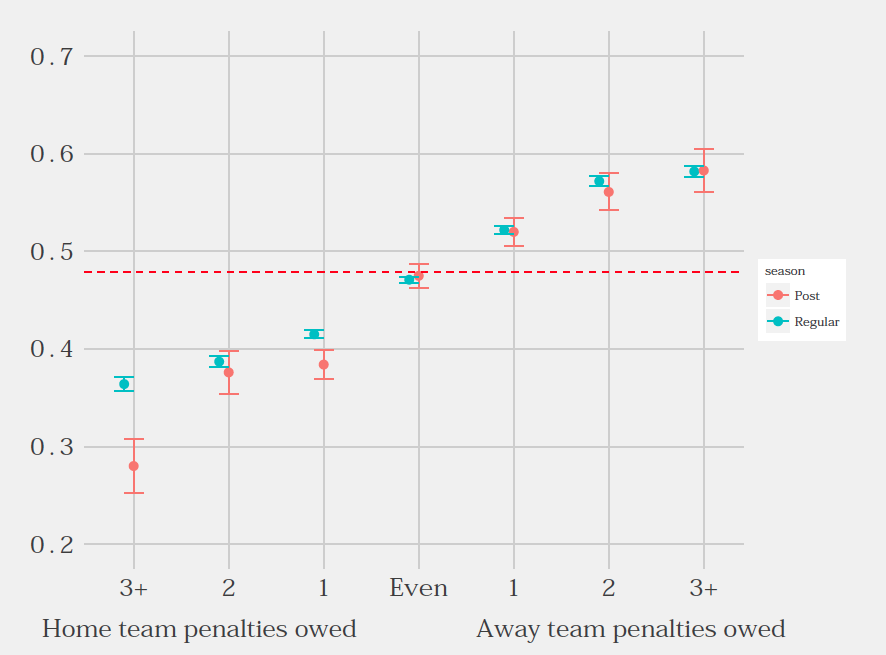 First, here’s a contrast of penalty violations, comparing the probability of a home team penalty by game type (regular, postseason).