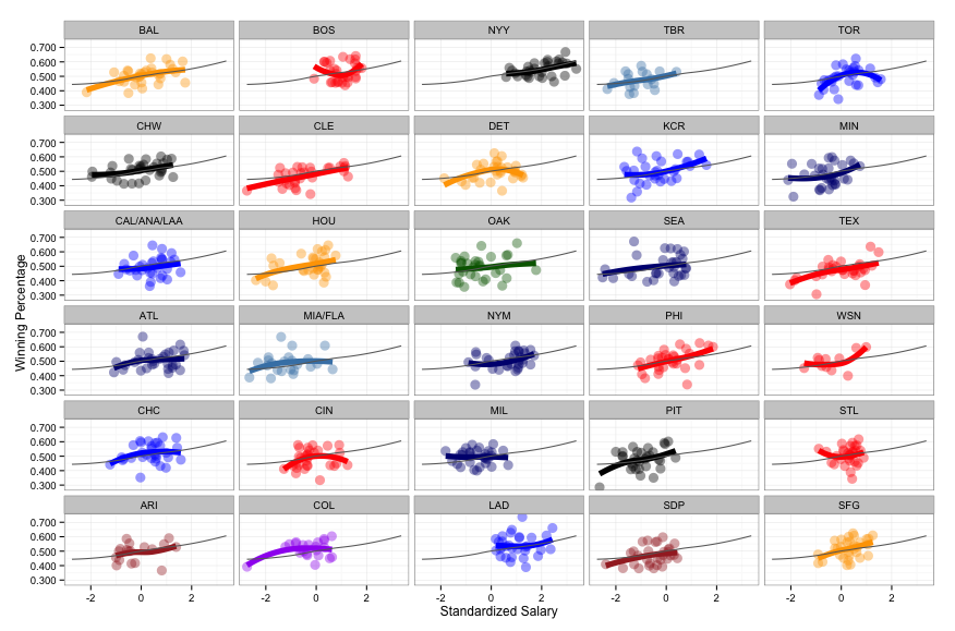 In our article, I used smoothed lines to express the relationship between winning and spending for each team. However, by and large, the plot for all teams together is nearly linear. Are the funky team-specific curves just due to chance?