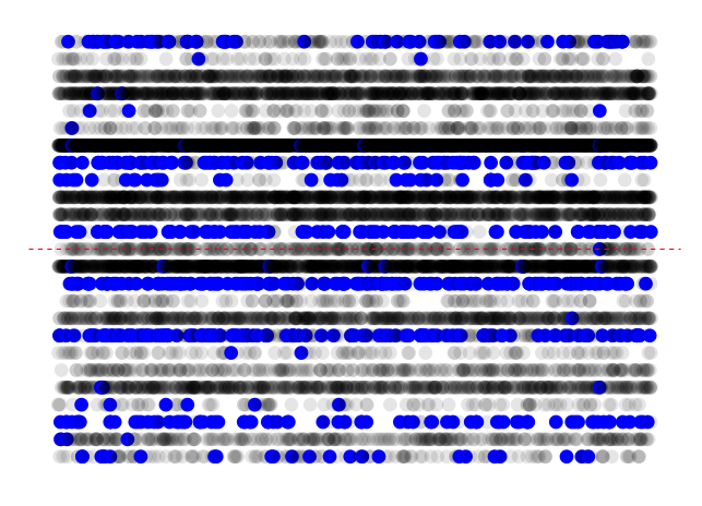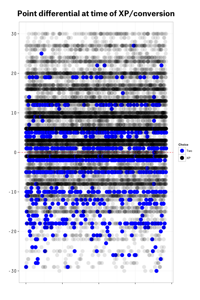 The x-axis in the chart above is an index, from 1 to 19,255. This represents the number of touchdowns since 2000. The y-axis represents is point differential for the team on offense (from down 12 to up 12). The light dotted red line in the middle intercepts the y-axis at 0. Finally, the dot depicts if the team went for two (blue is yes, light grey is no).